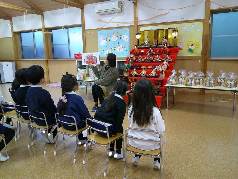 絵本を見ながら、おひなさまの由来や雛飾りの種類を知りました!