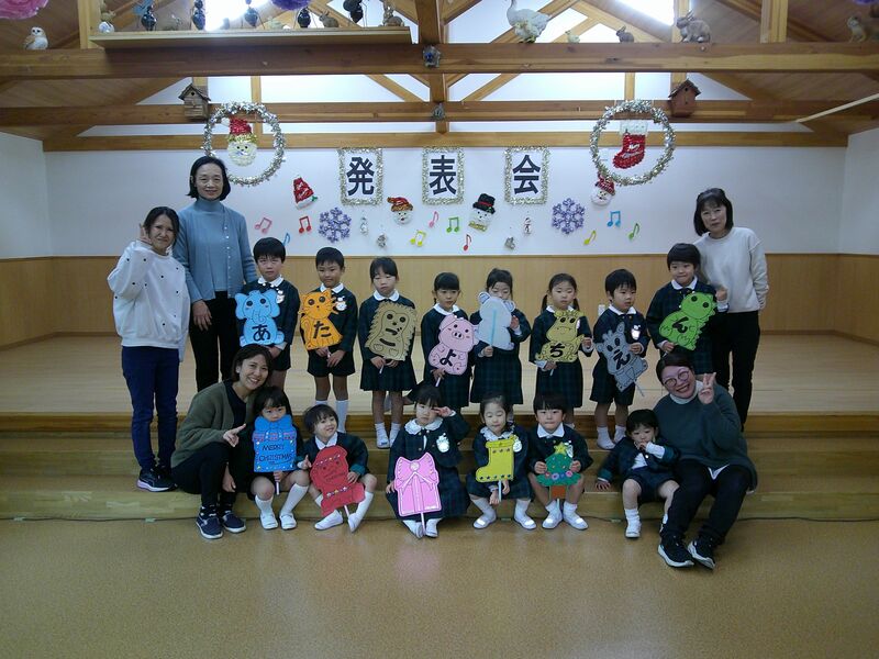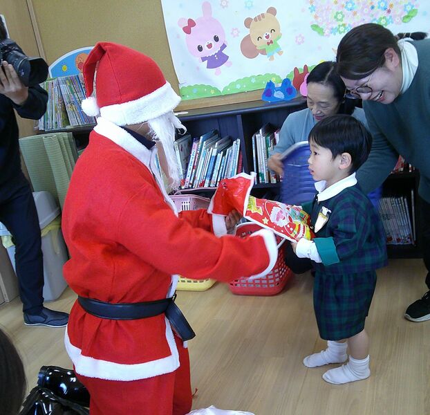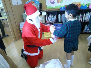 無事に発表が終わってホッとしていると、コンコンと扉を叩く音が。扉を開けると、なんと、、、サンタさんが!!!子どもたちも大喜びです😊「発表会頑張ったね!」と言って、サンタさんからプレゼントをもらいました!!