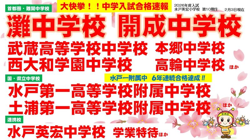 第10期生の6年生が、最難関中学校、水戸一高附属中学校、土浦一高附属中学校、水戸英宏中学校学業特待などの難関校への合格をはたすなど、大快挙の合格実績となっています。