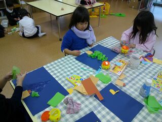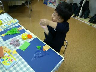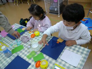 年中・年少・ひよこさんは、お花紙を貼ってツリーを🎄