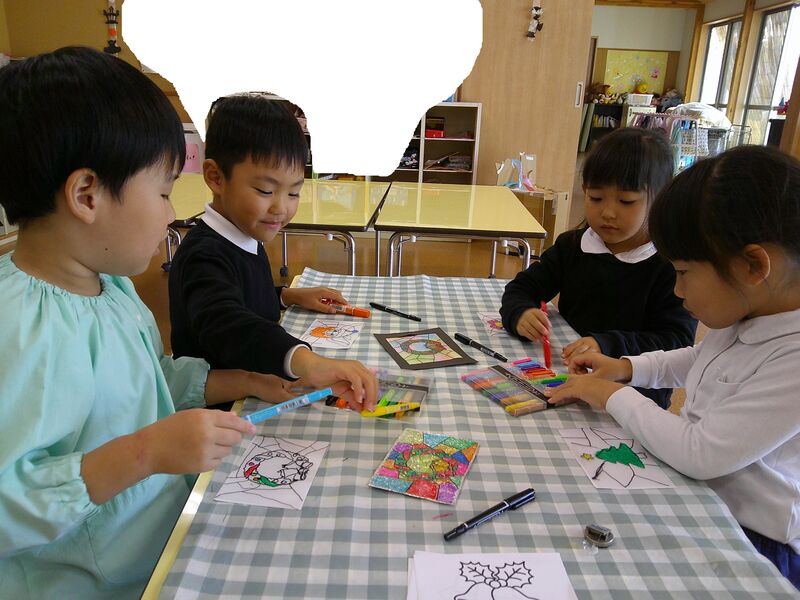 年長さんは、ペンで色をつけてステンドグラスを作りました!!
