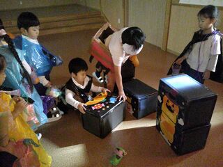 登園すると、衣装を着たり飾りをつけたり、ハロウィンパーティーの準備をし始める子ども達!